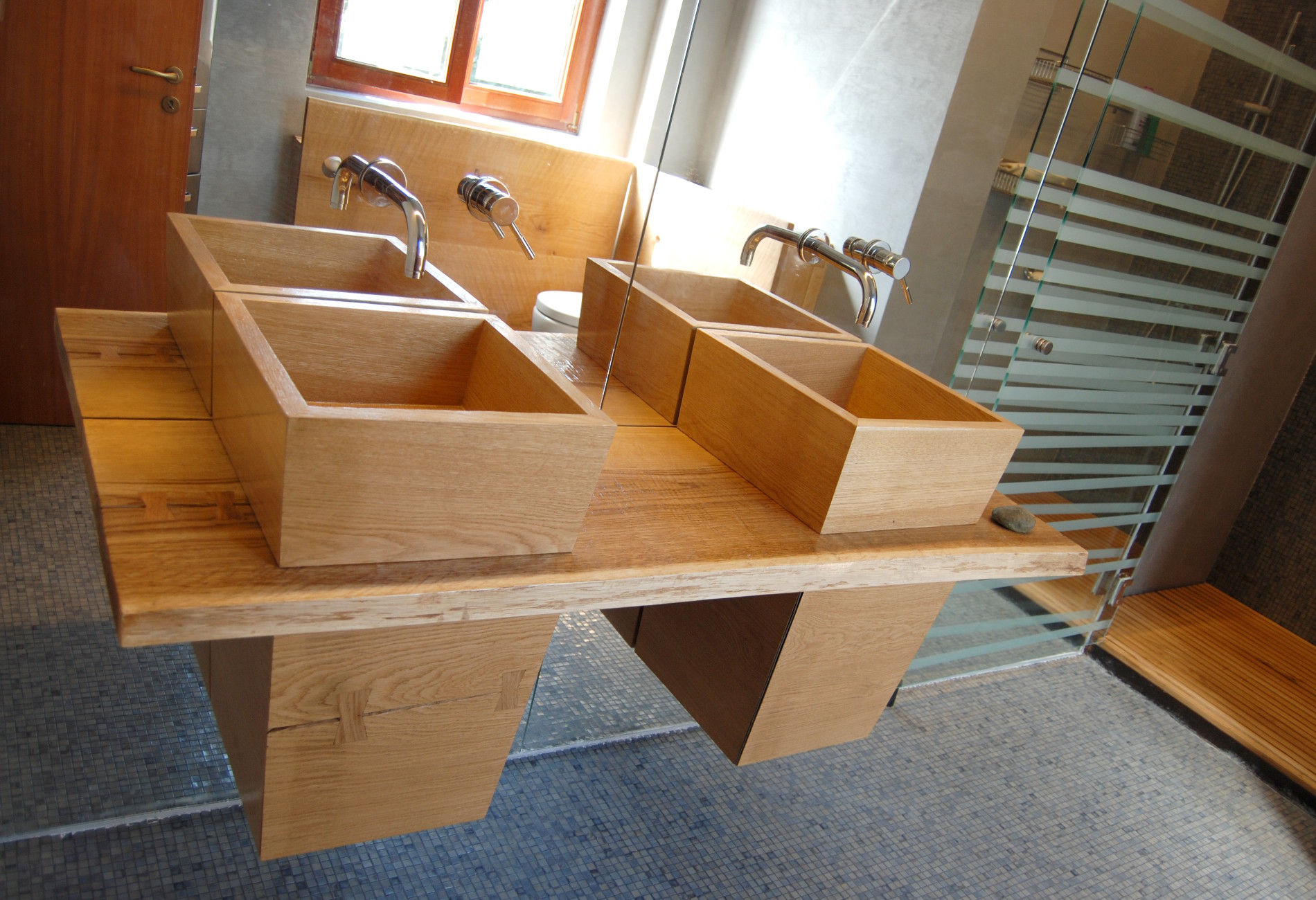 The darker Bisazza mosaics functions as a background for the lighter wood pieces, with the full wall mirrors acting as an enhancer for the whole space.