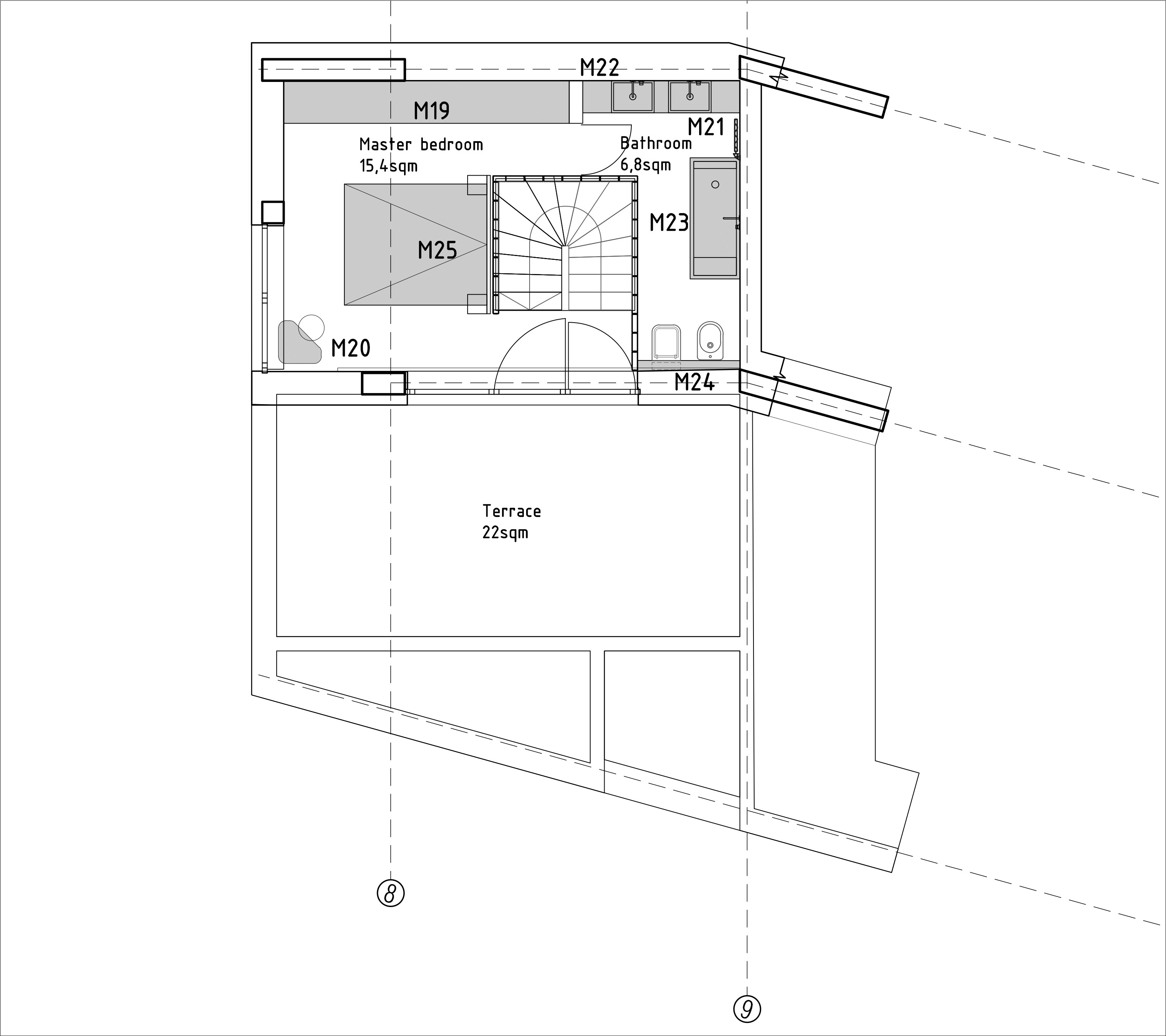 The apartment stretches over two levels, with ample terraces for the main spaces. The living room area features an ample space, with a large view towards the city.