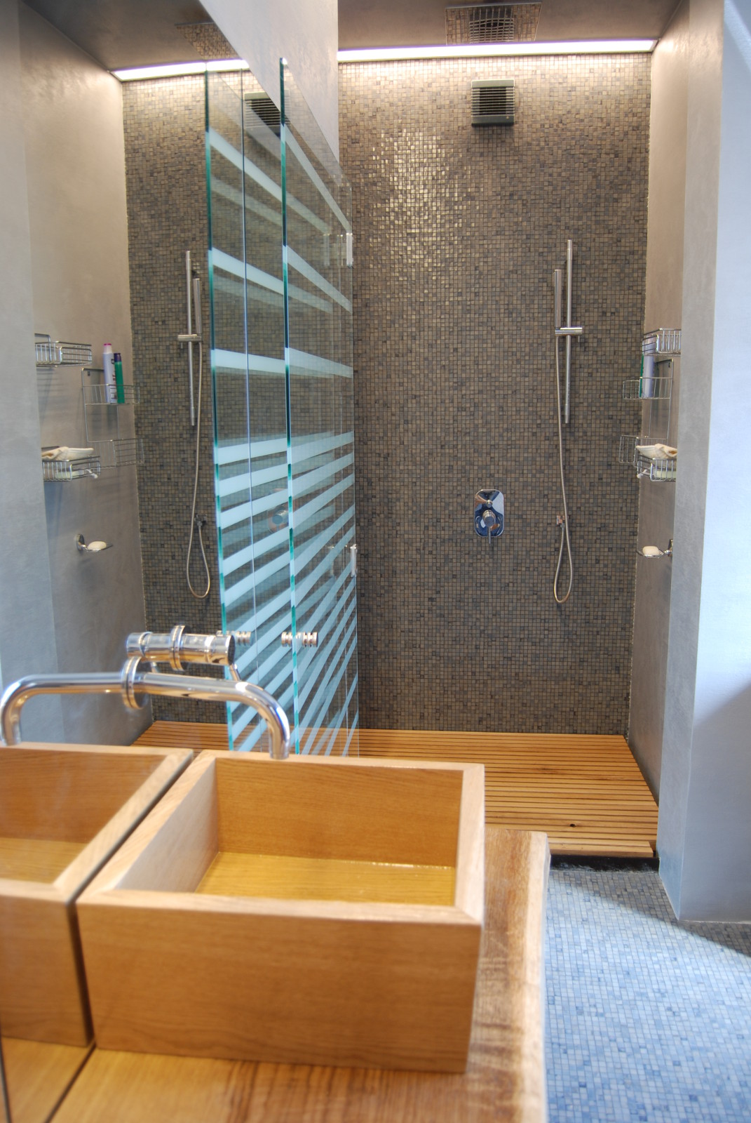 The darker Bisazza mosaics functions as a background for the lighter wood pieces, with the full wall mirrors acting as an enhancer for the whole space.